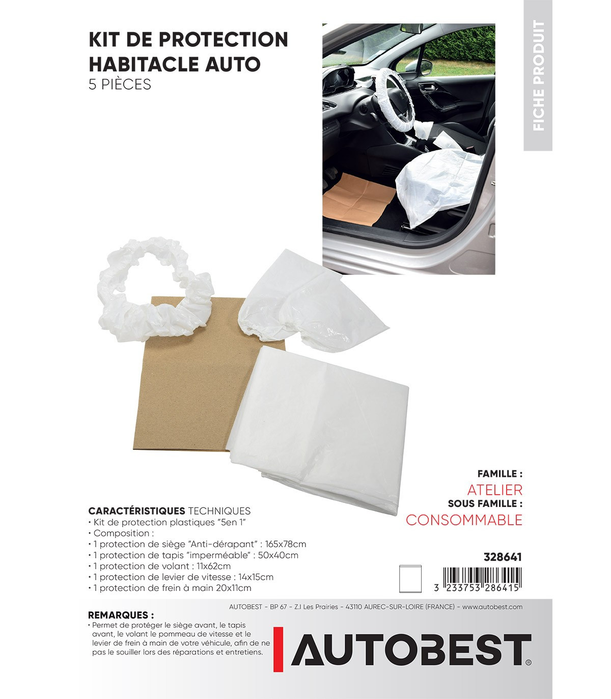 Permet de protéger le siège avant, le tapis avant, le volant le pommeau de vitesse et le levier de frein à main de votre véhicule, afin de ne pas le souiller lors des réparations et entretiens.