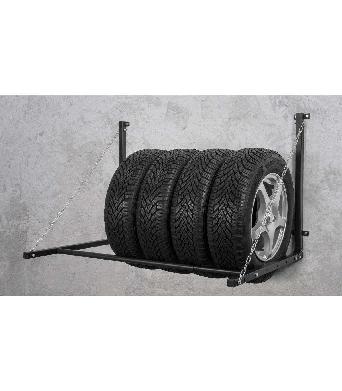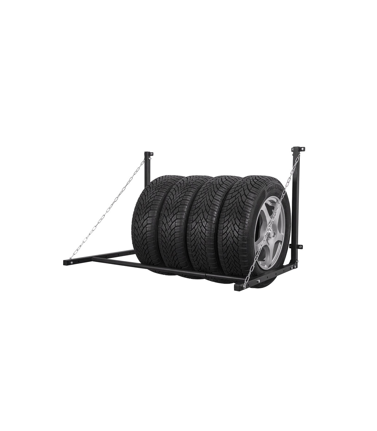 Ce support mural pour pneus, permet de remiser en hauteur (sans perte de place au sol), 4 pneus.